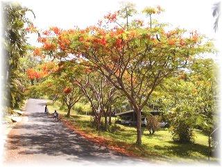 展望台への坂道で 火炎樹が満開! それにしてもサイクリングでは この坂道は厳しい 暑さも 日差しも 限界に達しています |