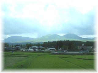 とは言っても、実はあそBOYの指定は 阿蘇−宮地の10分ぶんしか取れておらず 熊本で見送って、九州横断特急で 追いかけます 途中 阿蘇山がきれいに見えてきます